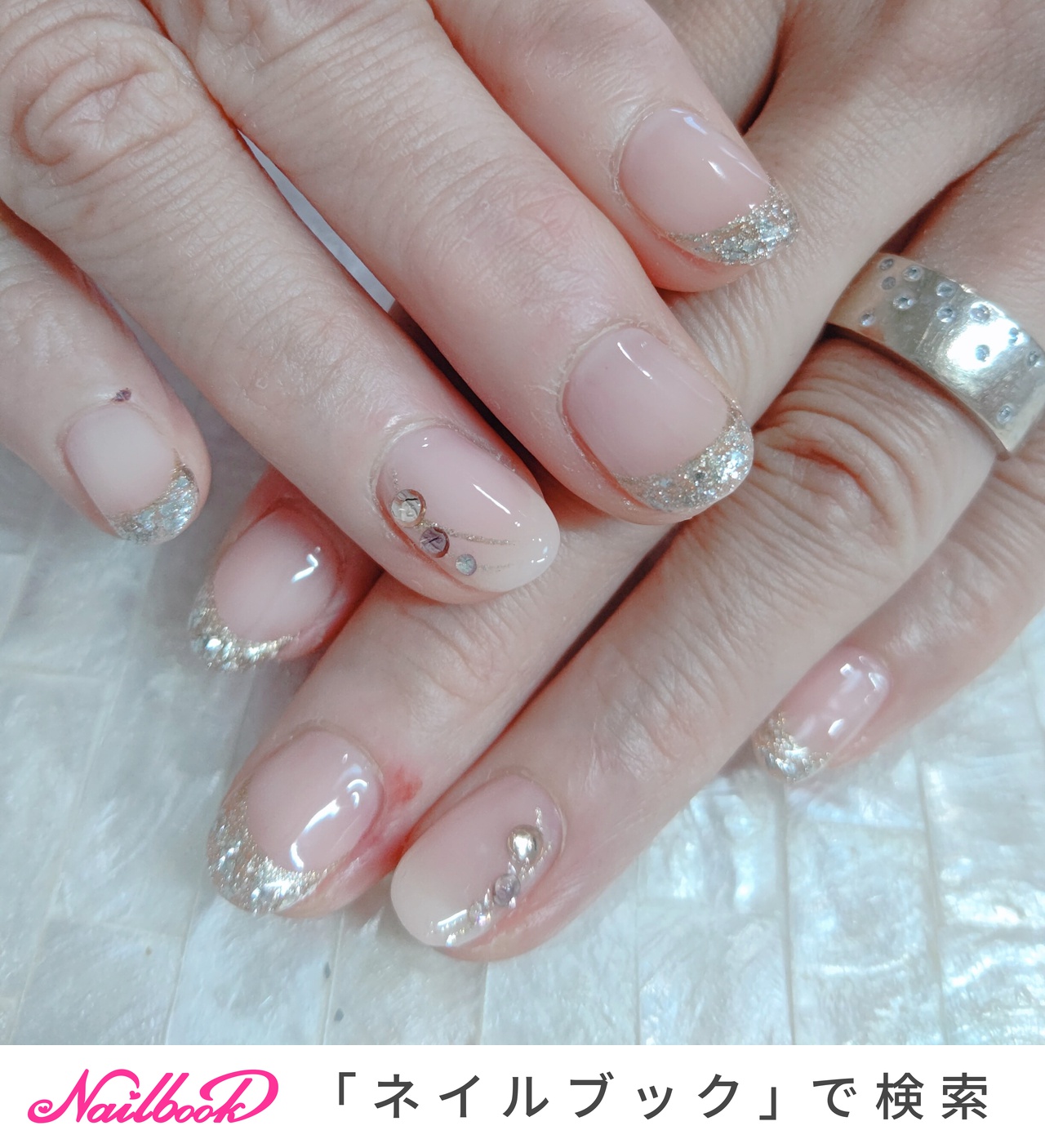 スキニーフレンチ ラメフレンチ ピンクゴールド ヌードカラー Vカットビジュー キラキラシンプル 大人ネイル 門真市のネイルサロン Kiko Nail